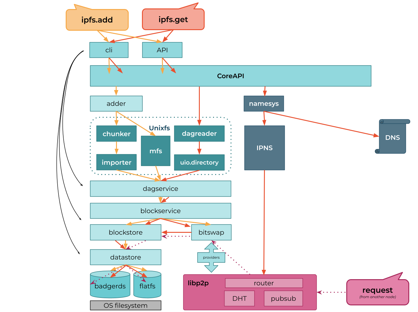 - Runs an IPFS-Node as a network service that is part of LAN and WAN DHT
